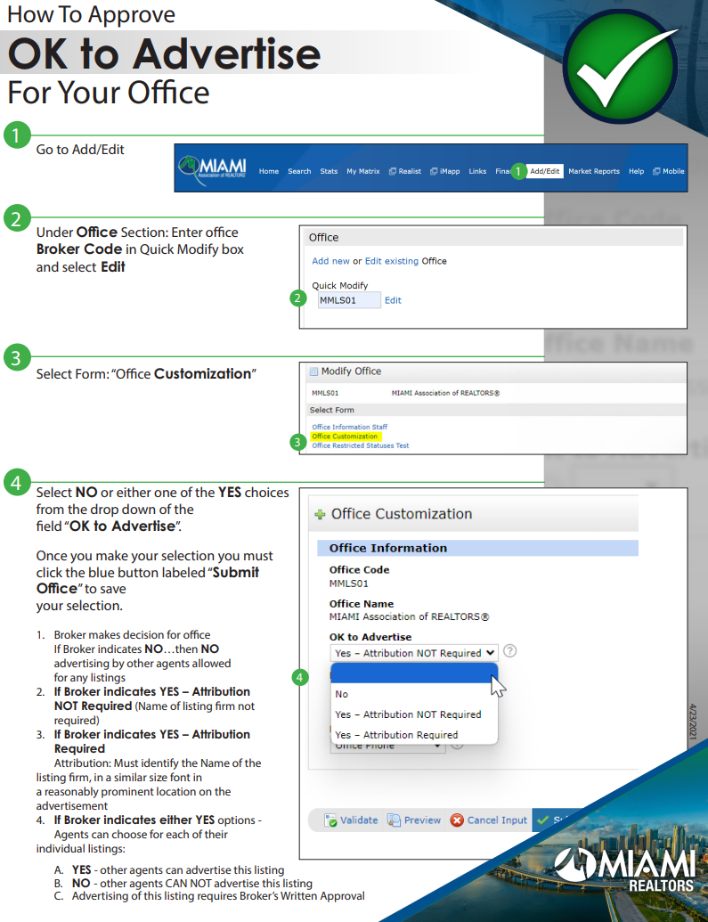 How To Approve OK to Advertise For Your Office Tyson October 01, 2024 20:51 Updated Related articles How To Update Office Settings In Matrix OK to Advertise when entering a listing Copy a previously listed property Copy your photos from a previously listed property OK to Advertise Recorded Webinar Comments 0 comments Article is closed for comments.